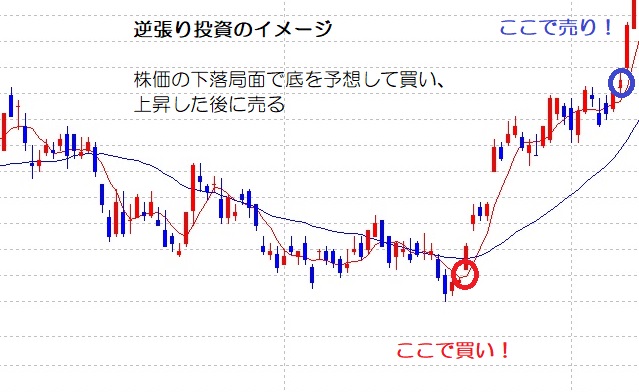 逆張り投資は底値で買って、上がってから売るため短期間で大きな利益が出る。ただし、「底値」を見極めるのは難しく、経験と勇気が必要なので専業投資家でもない限り難しくなる。