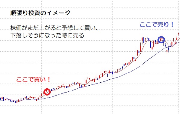 順張り投資とは、株価が今後もまだまだ上がると予想する時に買い、株価が下がると予想する時に売る、という投資の方法だ。