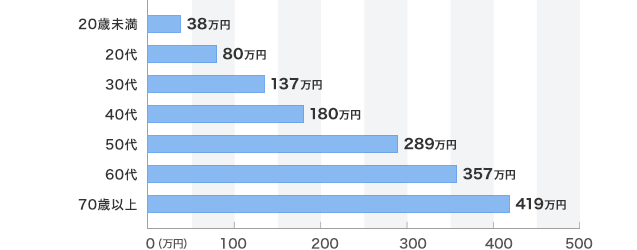 20歳未満が38万円、20歳代が80万円、30歳代が137万円、40歳代が180万円、50歳代が289万円、60歳代が357万円、70歳以上が419万円、というように高い年齢層ほど保有残高が高い傾向にある。