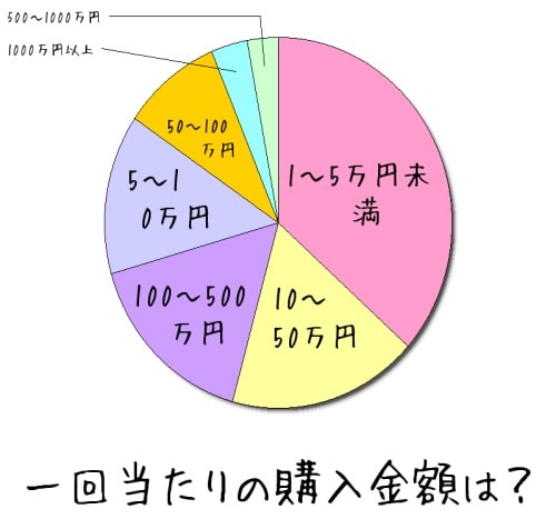 1~5万円未満の購入が33.3%と最も多く、5~10万円が12.7%、10~50万円が25.2%、50~100万円が8.4%、100~500万円が14.8%、500~1000万円が2.6%、1000万円以上が3.1%となっている。
