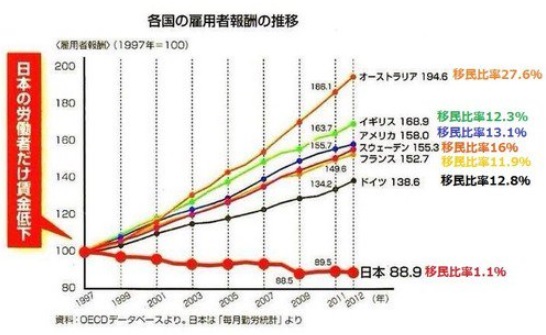 実際のデータを見ても日本の最低賃金はこの20年間で先進国の中でも唯一下がっています。これでは