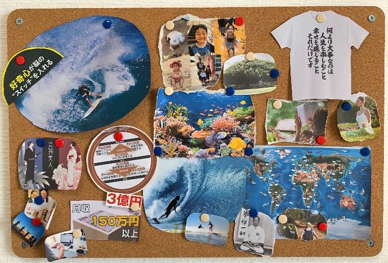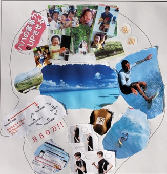 このコラージュは私が2013年に作ったものです。私の家族やサーフィン、運動指導の仕事やインターネットビジネスについての夢がちりばめられているんだ。サーフィンの部分が一番大きいというのは内緒ね( ゚Д゚)!